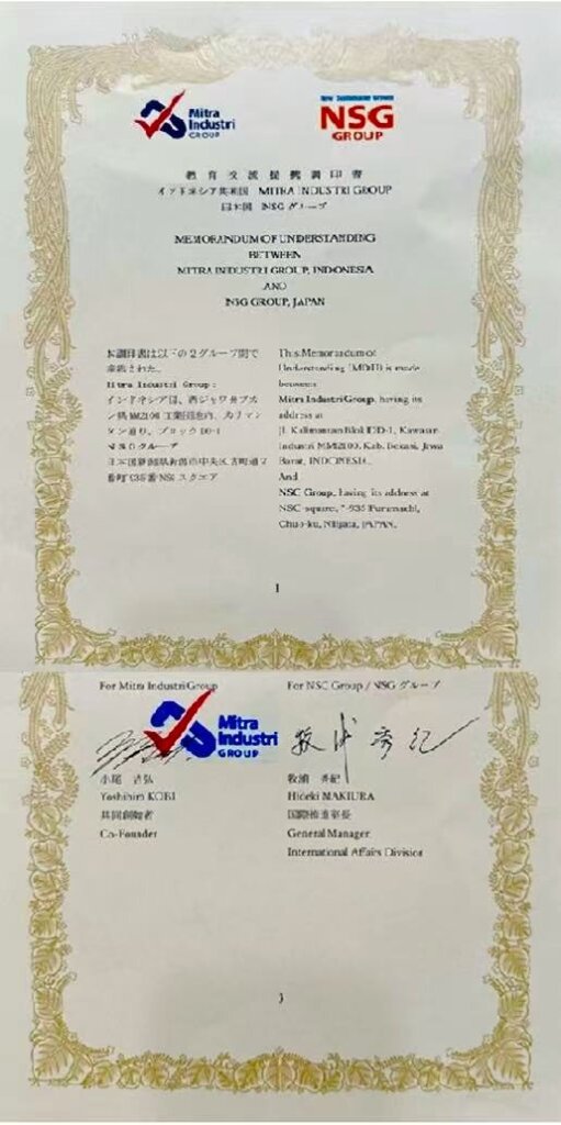 ミトラインダストリMM2100職業専門高校は、2012年に元丸紅の小尾吉弘氏が当時開発を担当されていた工業団地の仲間とともに設立した学校で、西ジャワ州ブカシ県のMM2100工業団地内にあります(ジャカルタまで車で約1時間)。ミトラ・インダストリ・マンディリ財団(YMIM)が運営し、二輪工学、自動車工学、産業電子工学、機械工学、電気技術工学、会計、ホテル・観光の7学科で構成されています。地元では「就職率100%校」として知られ、日系企業への就職や技能実習生での就労実績も高く、日本語教育にも力を注いでいます。2023年6月には、天皇陛下がインドネシアご訪問の際に視察された教育機関の一つとしても大きな注目を集めました。今年9月には4年制大学であるPoliteknik Mitra Industriを開学、デジタルビジネス学部、製造技術工学部、情報技術工学部の3学部体制で実践力の高い高度人材育成にも着手、インドネシアでも注目の教育機関の一つです。